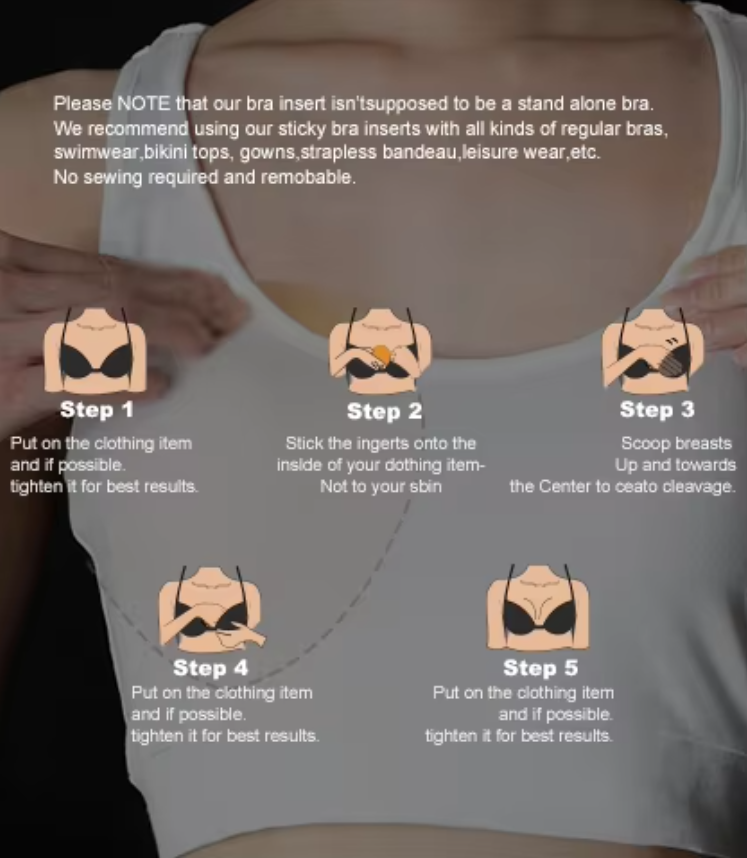 We recommend using our sticky bra inserts with all kinds of regular bras, swimwear,bikini tops,gowns,strapless bandeau,leisure wear,etc.
